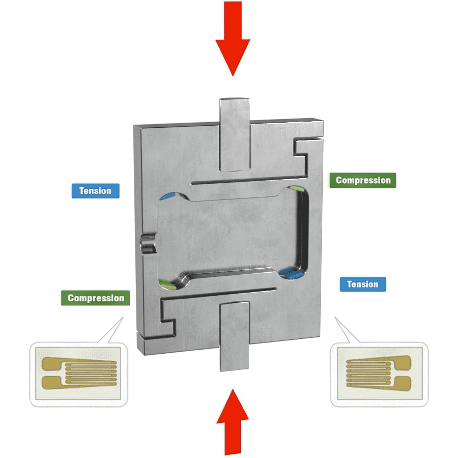 當(dāng)施加力(拉力或壓力)時(shí),金屬體充當(dāng)“彈簧”并略微變形,除非過載,否則它會(huì)恢復(fù)其原始形狀。當(dāng)撓曲變形時(shí),應(yīng)變計(jì)也會(huì)改變其形狀,從而改變其電阻,從而通過惠斯通電橋電路產(chǎn)生差分電壓變化。因此,電壓的變化與施加在撓性上的物理力成正比,可以通過稱重傳感器電路的電壓輸出來計(jì)算。